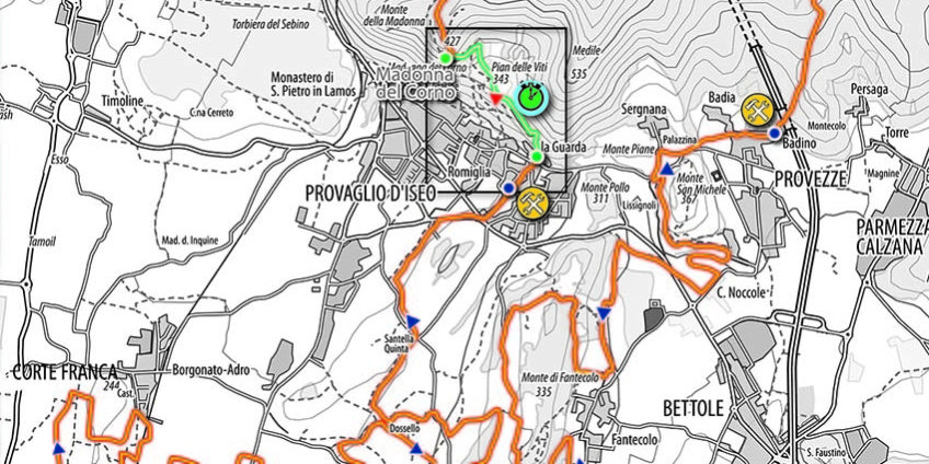 Riproposto il passaggio sotto la linea ferroviaria Brescia-Edolo, già sperimentato lo scorsso anno, si aggiunge un nuovo tratto suggestivo tra i vigneti della Franciacorta e buoni sterrati che conducono fino alla Località Boschi Alti di Calino.