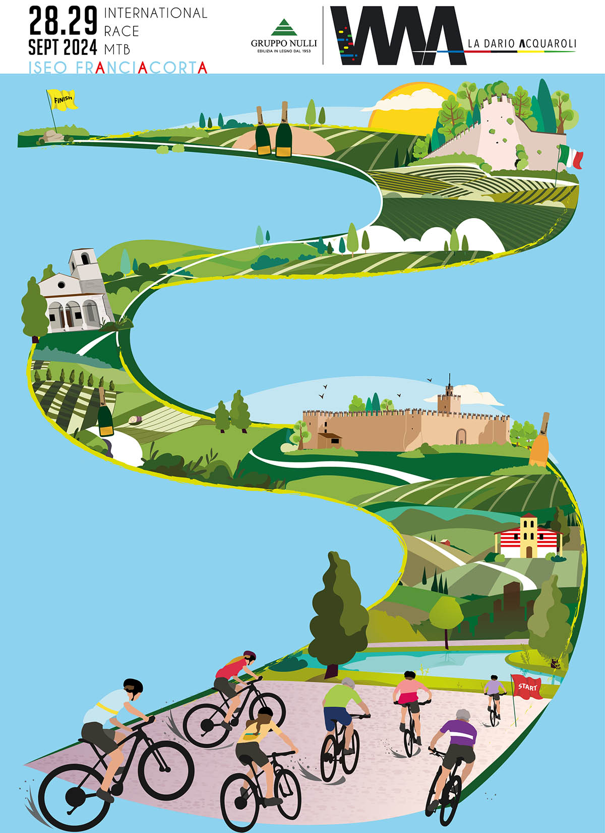 Con l’annuncio della nuova data, sveliamo anche la locandina e la linea grafica di La Dario Acquaroli 2024. Un gruppo colorato di biker che, inforcata la loro mountain-bike, attraversano la splendida Franciacorta tra torbiere, lago, vigneti, natura rigogliosa, antiche dimore e ville storiche, castelli, chiese e l’immancabile bottiglia di bollicine. L’essenza di questa terra. L’essenza di La Dario Acquaroli che aspetta anche quest’anno migliaia di appassionati biker.