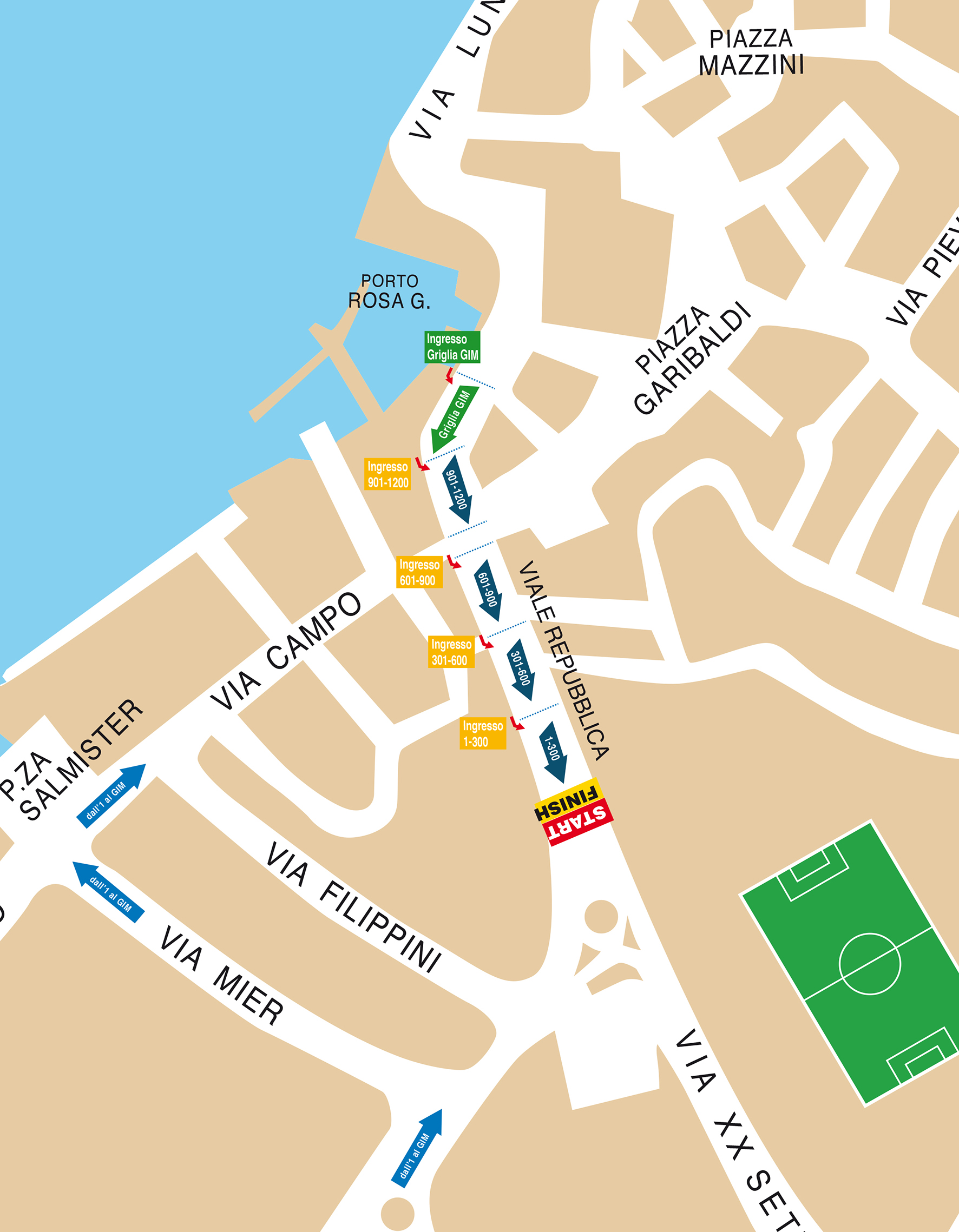 Per facilitare la partenza e per permettere un ordinato avvio della gara abbiamo predisposto 4 griglie. Non sarà permesso a nessuno di entrare nella griglia diversa da quella assegnata. Il proprio numero gara determina la griglia di partenza. Chi anticiperà la partenza o prenderà il via senza il dovuto controllo situato sulla linea di partenza verrà considerato non partito e pertanto non apparirà nella classifica ufficiale. Si chiede di mettere in campo la massima sportività. L’ingresso sarà consentito dalle ore 9.10 alle ore 9.50, oltre tale orario i ritardatari partiranno in ultima griglia.